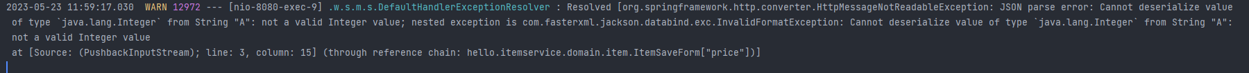 검증 실패1과 출력 결과가 다르다. log 자체가 찍히지도 않았다. price 필드는 Integer 타입이기 때문에 문자를 저장할 수 없다. 이 경우는 ItemSaveForm 객체 자체를 생성하지 못한 경우이다. 그렇기에 Controller 자체가 호출되지 못하고 예외가 발생한 경우이다.