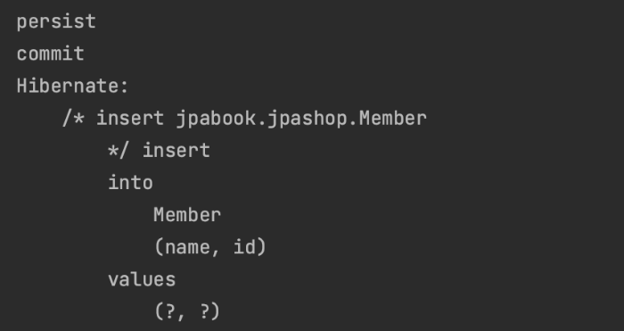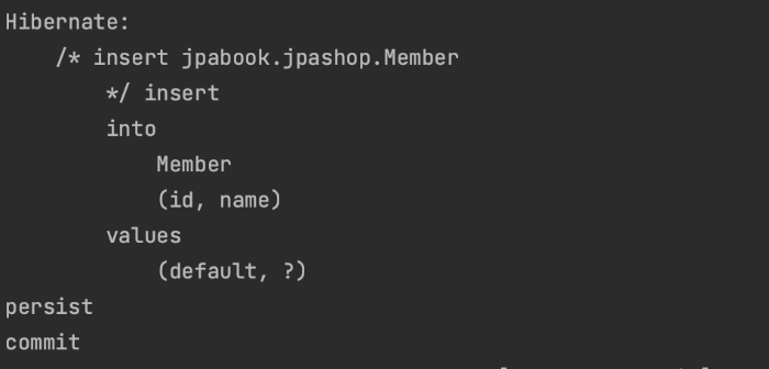 엔티티를 persist()했을 때 Insert 쿼리문이 나가지 않음을 알 수 있다. persist() 시점에는 쓰기 지연 SQL 저장소에 쿼리문을 보관한다. 이후에 commit을 할때 쓰기 지연 SQL 저장소에 보관된 쿼리문이 DB로 날라가게 된다.