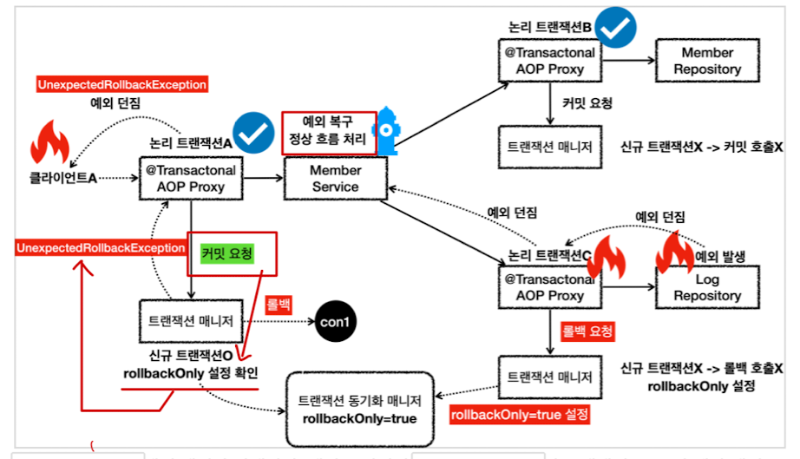 예외 1은 rollbackOnly를 확인하지 않고 바로 RuntimeException 예외를 던졌고, 예외 2는 외부 트랜잭션은 커밋 요청을 하였으나 rollbackOnly로 인해 내부 트랜잭션이 롤백을 호출하였기 때문에 UnexpectedRollbackException 예외를 던진다.