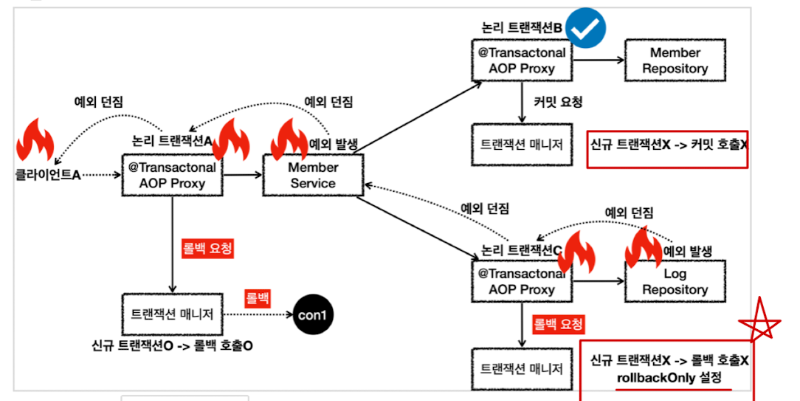아래의 경우 MemberService에서 트랜잭션이 시작되었고, MemberRepository와 LogRepository는 MemberService에서 시작된 트랜잭션에 참여하게 된다.(Propagation.REQUIRED) MemberRepository는 정상적으로 처리되어 커밋이 호출되었고 LogRepository는 중간에 문제가 생겨 롤백을 호출하는 상황이다. 내부 트랜잭션에서 롤백을 호출하면 사용 중인 Connection에 롤백을 호출하는 것이 아닌 rollbackOnly 표시를 하게 된다. 이 표시는 마지막에 외부 트랜잭션이 확인하여 커밋 또는 롤백을 처리하는 데 사용된다.