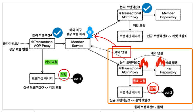 LogRepository가 트랜잭션에 참여하던 때에는 MemberService에서 사용하는 커넥션에 rollbackOnly가 붙기때문에 커밋을 요청하더라도 롤백을 처리해야 했다. 그러나 새로운 트랜잭션을 생성하면서 LogRepository에서 롤백을 하더라도 자신만 사용하는 트랜잭션이기 때문에 rollbackOnly를 표시하지 않고 바로 롤백처리를 하게 된다. 따라서 MemberService에서 사용하는 트랜잭션은 커밋을 정상적으로 수행하게 된다.