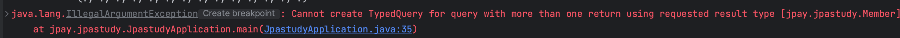 역시나 컴파일러는 잘못이 없다. 내가 코드를 잘못 짜서 발생한 문제이다. Query 객체는 createQuery() 메서드에 반환타입의 정보를 넘겨줄 필요가 없다. 즉 em.createQuery("select m.name, m.age from Member m", Member.class); Member.class 클래스 정보를 넘겨줄 필요가 없다.