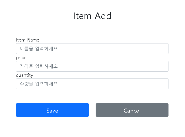 현재 사용자가 입력하려고 하는 화면은 다음과 같다. Item Name, price, quantity 필드가 존재하는데 각 필드별 값들은 Item 객체에 저장된다.