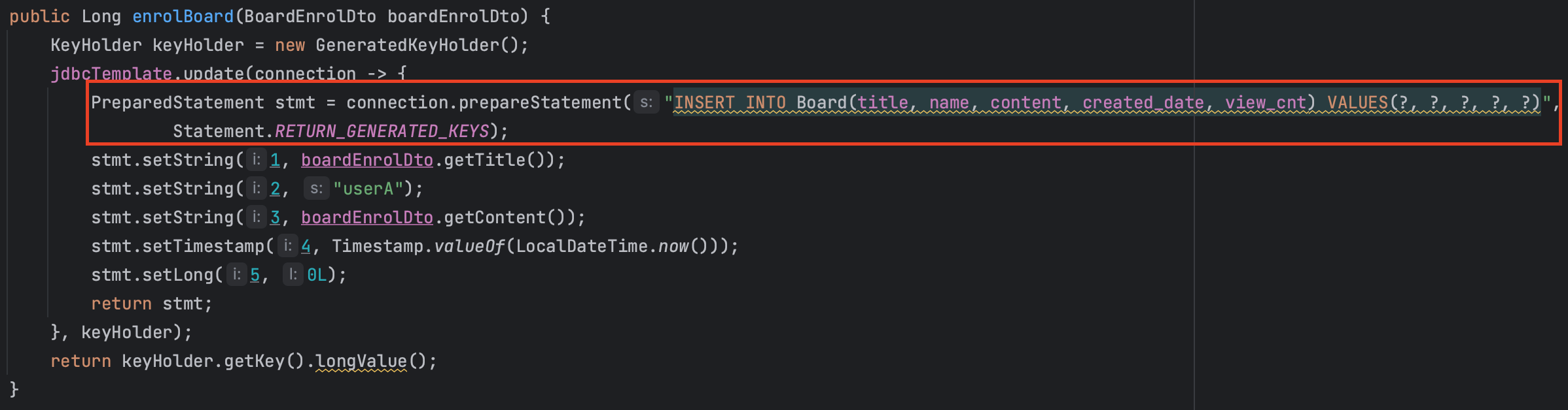 PreparedStatement stmt = connection.prepareStatement("INSERT INTO Board(title, name, content, created_date, view_cnt) VALUES(?, ?, ?, ?, ?)");