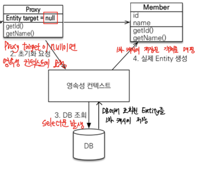- Proxy 객체를 초기화할 때, Proxy 객체가 실제 Entity로 바뀌지 않는다. Proxy 객체가 초기화되면 Proxy 객체를 통해 실제 Entity에 접근한다.