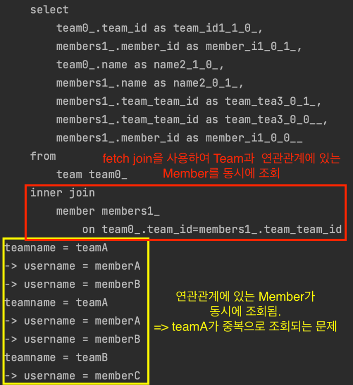 N:1에서 fetch join 할 때와 달리 Team(teamA)이 중복으로 조회되는 문제가 발생하였습니다. 이는 객체와 RDB(관계형 데이터베이스) 간의 차이점에 의해 발생하는 문제입니다.