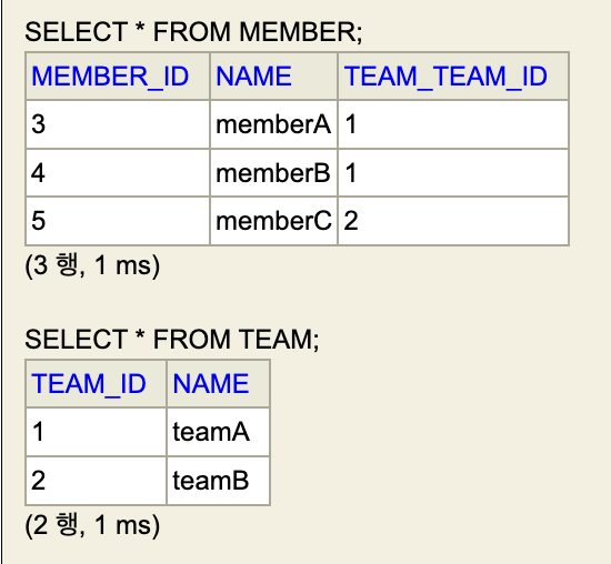 - ID가 1과 2인 Member가 ID가 1인 Team을 외래키로 참조