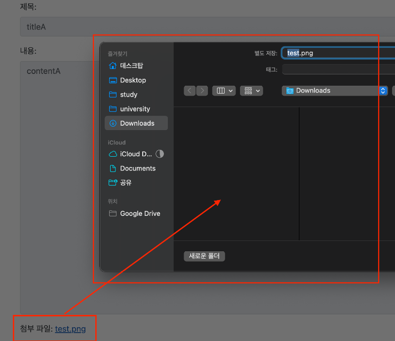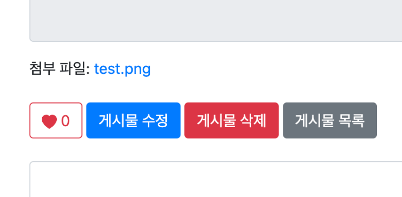 아래 사진을 보면 첨부 파일이 존재합니다. 첨부 파일을 다운받기 위해서는 서버에 저장된 경로에 접근해야 합니다. 이미지 파일을 업로드할 때 DB에서 파일이 저장된 경로도 저장하였으므로 이를 사용하면 됩니다.