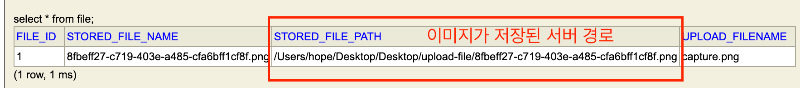 DB를 보면 STORED_FILE_PATH 컬럼에 서버 경로가 저장되어 있습니다.