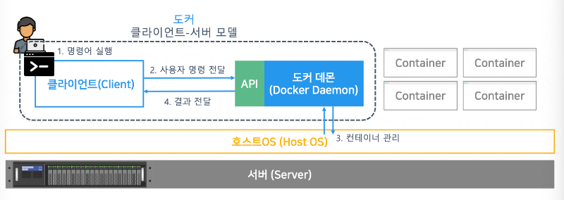 클라이언트는 명령어를 실행하여 서버에 요청하게 됩니다. 서버에 요청된 명령어는 도커 데몬(Docker Daemon)이 전달받아 요청을 처리합니다. 여기서 데몬이란 서버에서 지속적으로 실행되는 소프트웨어를 의미합니다. 즉 Host OS에서 지속적으로 실행되면서 클라이언트의 요청을 받아 처리합니다.