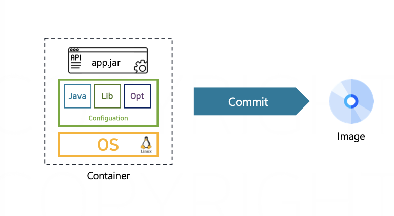 컨테이너에서 변경된 파일 시스템의 스냅샷을 촬영하여 새로운 이미지를 생성한다. 여기서 스냅샷이란 해당 컨테이너의 파일 시스템과 생타를 특정 시점에서 저장하는 것을 말한다. 해당 시잠의 상태를 기록함으로써 컨테이너 상태를 복원하거나 이미지로 저장할 수 있다.