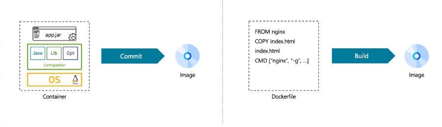 새로운 이미지를 생성하는 방식으로 commit과 build 2가지 방법이 존재한다. Commit 방식은 현재 컨테이너의 상태를 이미지로 만드는 것이고, Build 방식은 Dockerfile을 만들고 이것을 이미지로 만드는 방식이다.
