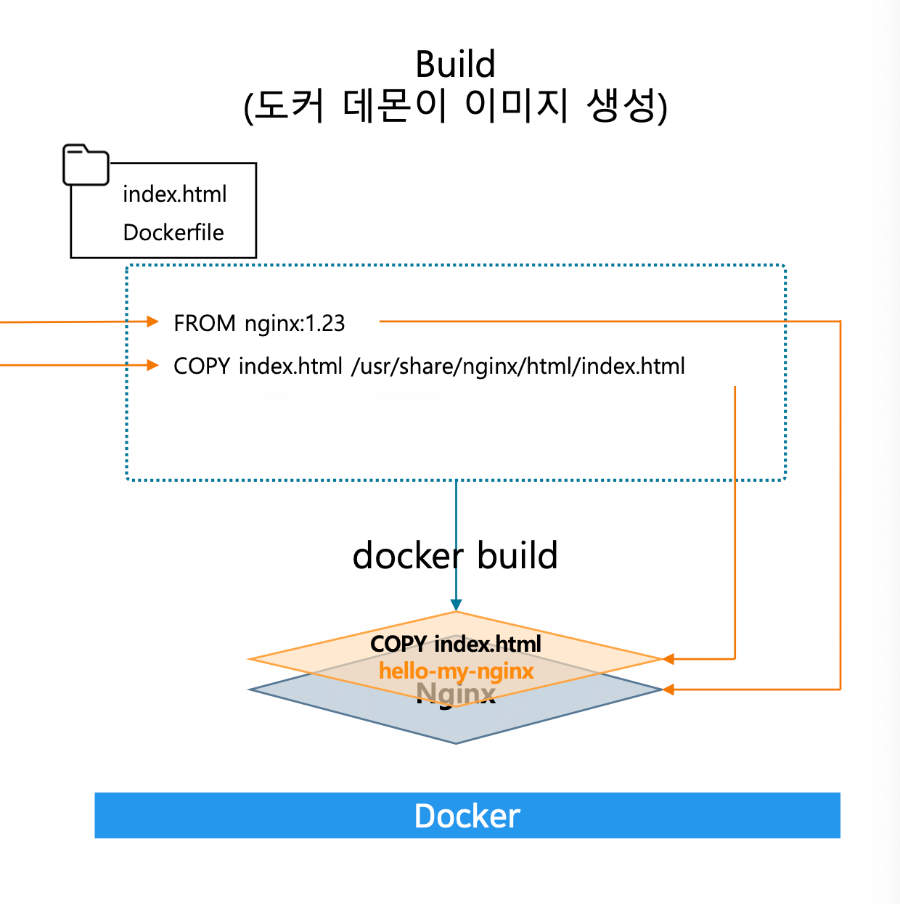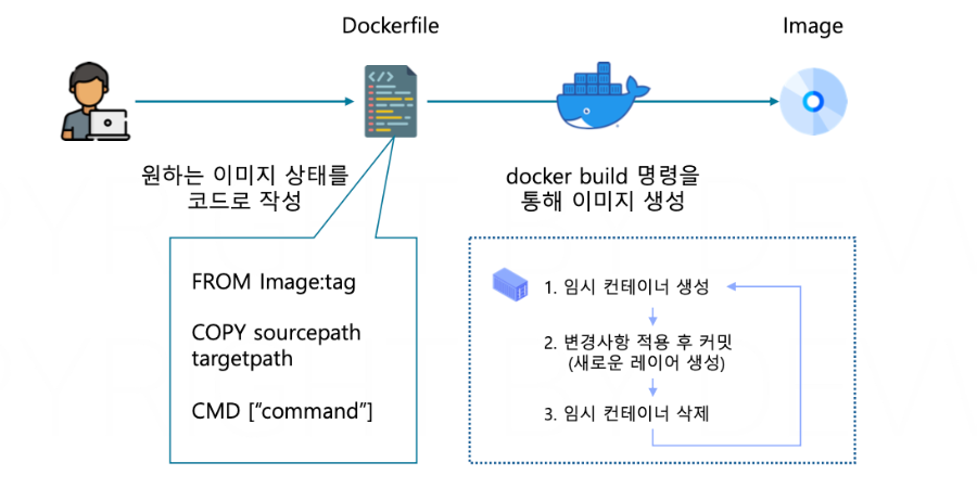 - 이미지 build : Dockerfile에 적성된 명령어 COPY, RUN, ENV 등을 순차적으로 실행하여 이미지를 빌드합니다.