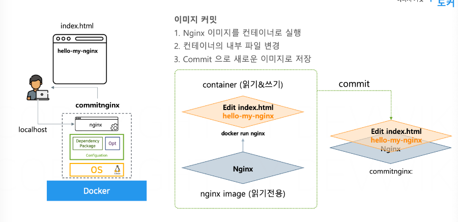 - Nginx 이미지에 존재하는 index.html 수정 => 도커 컨테이너 변경 사항 발생