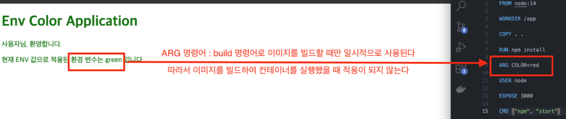 ARG 명령어는 빌드 시간에만 적용됩니다. 즉 이미지를 빌드할 때만 해당 옵션의 값이 사용되고, 이 이미지로 생성한 컨테이너에서는 적용되지 않습니다. 그렇다면 ARG 명령어를 굳이 왜 사용하는 걸까요? 동일한 Dockerfile을 여러 환경에서 사용한다고 생각해 봅시다. 예를 들어, 개발 환경에서는 디버그 모드를 활성화하고, 운영환경에서는 디버그 모드를 비활성화할 수 있습니다.