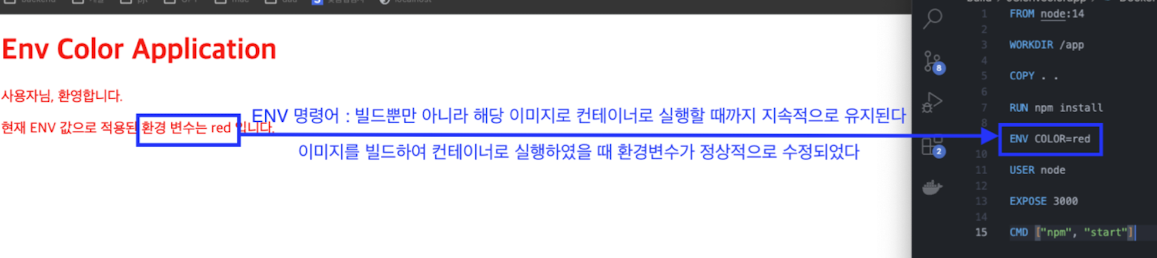 ARG 명령어와 마찬가지로 Dockerfile의 ENV 명령어에 red 값을 지정하였습니다. 해당 이미지를 빌드 후 실행하면 ARG 명령어와 달리 정상적으로 변경되어 있음을 알 수 있습니다.