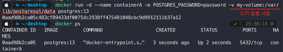 ContainerA를 통해 새로운 데이터베이스를 생성하고 컨테이너를 제거하였습니다. 이후 Container-newA를 생성하여 도커 볼륨을 조회한 결과 mydb가 그대로 유지되어 있음을 확인할 수 있습니다.