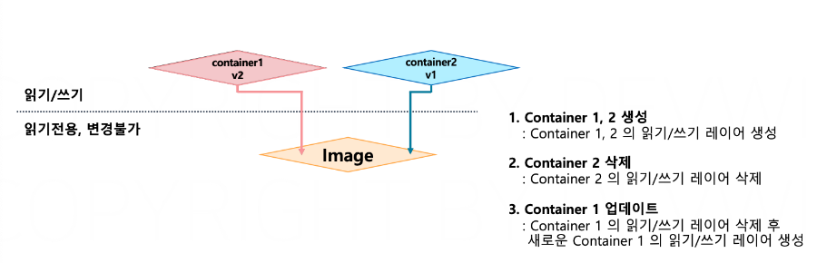 도커 컨테이너는 상태를 저장하지 않는 Stateless 특징을 갖습니다. A 이미지로 컨테이너를 실행하다가 삭제하고 다시 컨테이너를 생성하면 이전의 변경사항이 모두 삭제됩니다. 왜냐하면 읽기 전용인 이미지를 컨테이너로 생성하면 R/W 컨테이너 레이어가 생성됩니다. 해당 컨테이너에서 변경사항은 R/W 컨테이너 레이어 위에 추가되기 때문에 컨테이너를 삭제할 시에 변경사항이 모두 삭제됩니다.