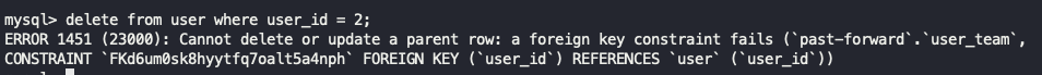 Id로 2를 갖는 User를 지우려고 하니 foreign key constraint 에러가 뜬다. 이것을 무결성 문제라고 한다. 자세히 읽어보면 user_team과 문제가 있음을 알 수 있다. user_team 테이블에 value 값으로 2를 갖는 user_id 필드(외래키)가 있기 때문에 해당 row를 먼저 제거하고 User를 삭제할 수 있다는 에러이다.