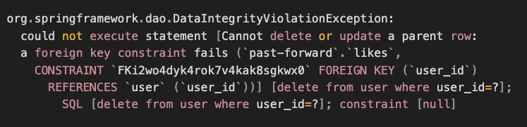다시 Id가 2인 User를 삭제하는 쿼리문을 발생시키니 또 에러가 발생한다. 이번에는 likes 테이블에서 foreign key constraint 문제가 발생했다.