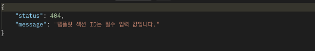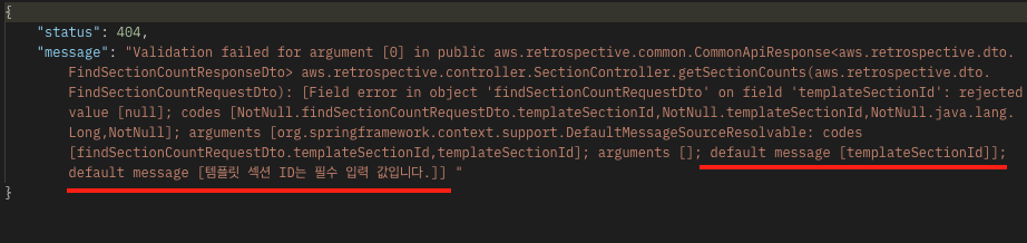 여기서 문제점은 예외 메시지가 너무 길다는 것이다. 나는 @NotNull에 작성한 "템플릿 섹션 ID는 필수 입력 값입니다."만 필요할 뿐이다.
