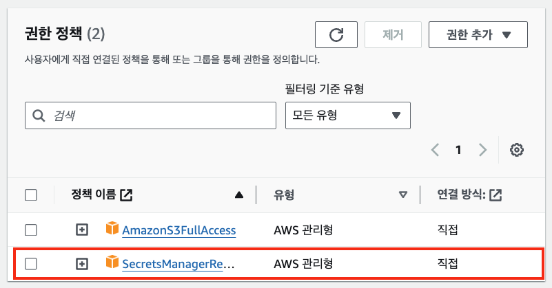위에서 등록한 보안 암호를 사용하기 위해서는 IAM에 SecretsManagerReadWrite 권한이 필요하다. IAM에 해당 권한을 부여한다.
