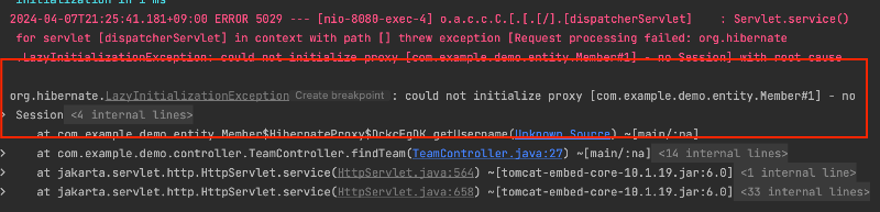 OSIV가 켜져있을 때와 코드는 동일하고, Team을 조회 후 dto로 변환하는 findItem API를 호출해보겠습니다. 에러 메시지를 보면 could not initialize proxy 오류가 발생했습니다. 이는 Controller까지 영속성 컨텍스트가 유지되지 않기 때문에 발생합니다.