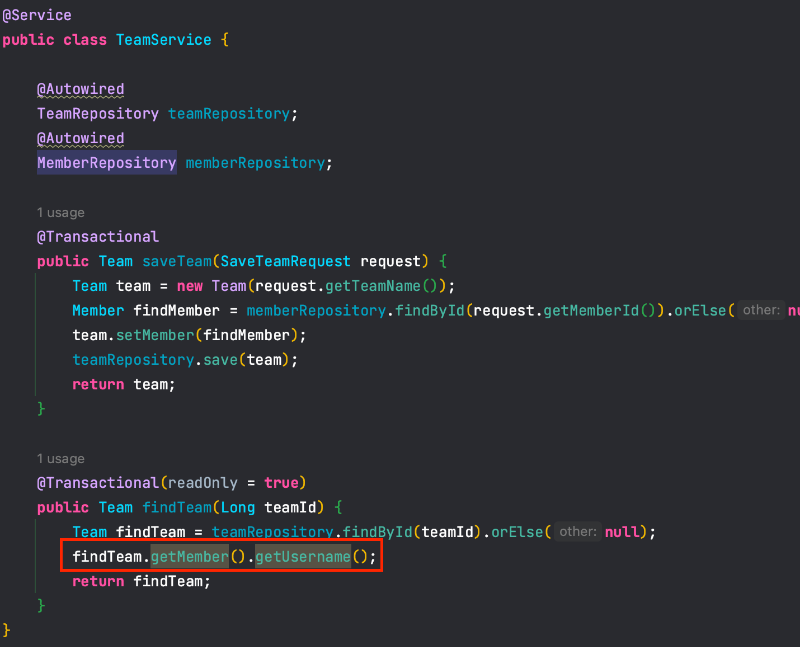 OSIV가 켜져있기 때문에 Service 레이어에서 트랜잭션이 종료되더라도 영속성 컨텍스트가 종료되지 않고 Controller에서도 유지됩니다. TeamController의 findTeam API를 보면 Service 레이어에서 조회된 엔티티를 dto로 변환하는 로직이 있습니다. 영속성 컨텍스트가 살아있기 때문에 Team과 지연로딩 관계에 있는 Member를 사용하여 dto로 변환할 수 있는 것입니다.