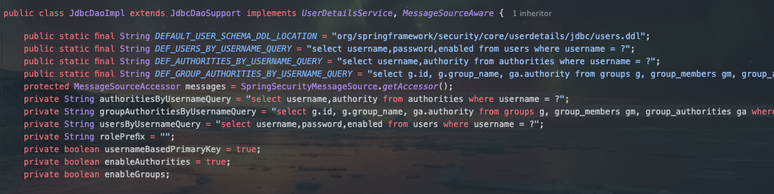 JdbcUserDetailsManager는 JdbcDaoImpl을 상속받고 있습니다. 특이한 점은 Select 절이 미리 정의되어 있습니다. -> select username, password, enabled...
