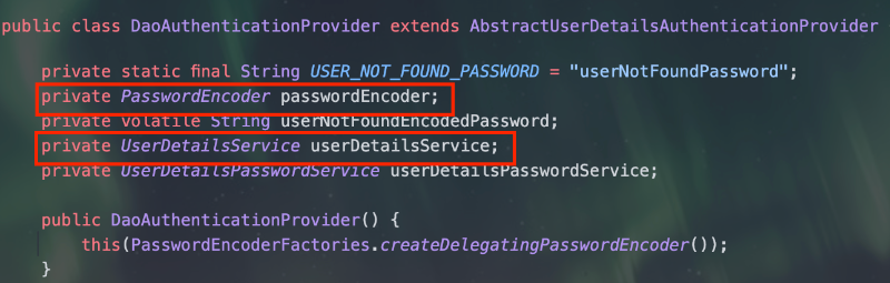 DaoAuthenticationProvider는 UserDetailsService 및 PasswordEncoder를 사용하여 인증을 수행합니다. UserDetailsService는 loadUserByUsername()을 호출하여 데이터베이스로부터 사용자의 정보를 UserDetails 형태로 가져옵니다. 이때, UserDetails가 조회되지 않으면 예외가 발생합니다.