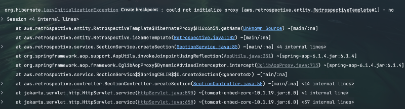 하지만.... 에러가 발생합니다. 에러 로그를 보니 could not initialize proxy 문제가 발생합니다. 지연로딩과 관련이 있는 듯합니다.