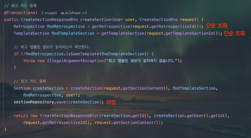 현재 프로젝트에서 제가 담당한 코드의 일부분입니다. JpaRepository를 사용하여 단순히 엔티티를 조회 및 저장을 하고 있습니다. CrudRepository를 사용하여 단순히 CRUD를 진행하고 있기 때문에 @Transactional이 필요하지 않습니다.
