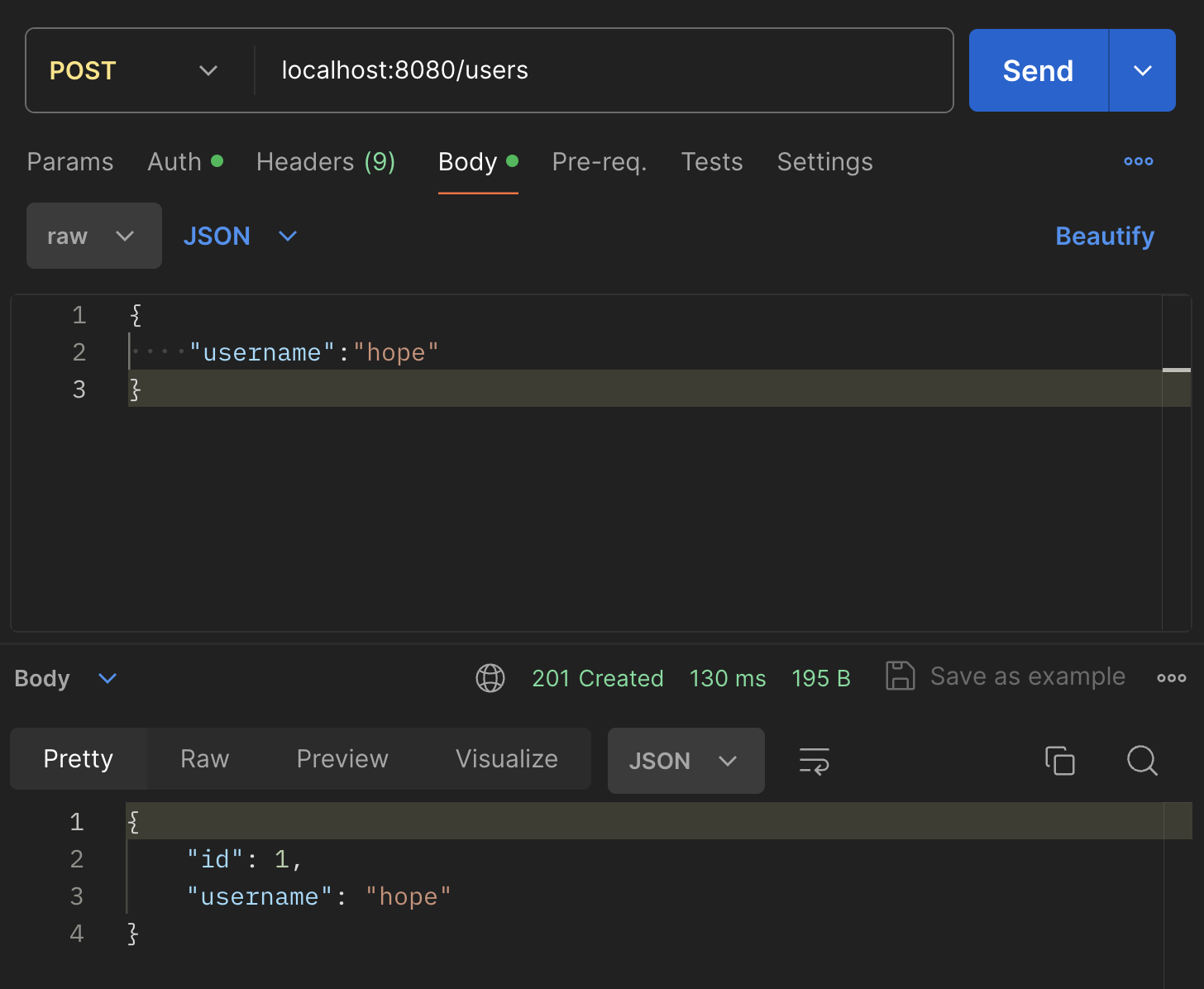 POST /users 를 호출하면 DB에 정상적으로 사용자가 저장되었음을 알 수 있습니다.
