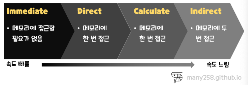 주소 지정 방식이란 연산이 수행될 데이터의 위치를 찾는 방법입니다. 주소 지정 방식에는 5가지 유형으로 나뉩니다.
