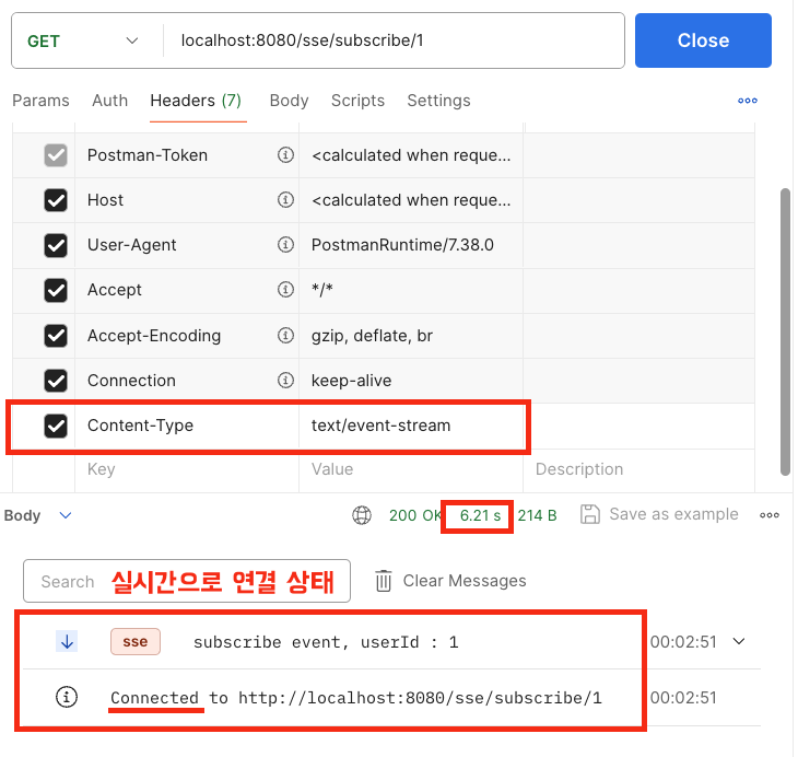 먼저 클라이언트와 서버가 구독 상태이어야 합니다. GET 요청을 통해 처리할 수 있으며, 요청 Mime Type으로 "text/event-stream"으로 전송해야 합니다. text/event-stream은 SSE를 사용하기 위한 미디어 타입입니다.