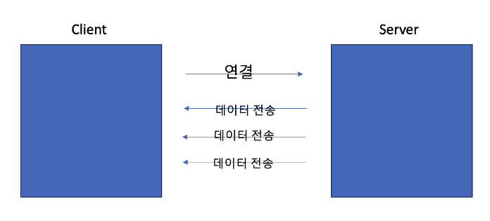 위 사진을 보면 클라이언트가 서버와 연결을 먼저 진행합니다. 이를 구독(subscribe)라고 합니다. 이후에 서버에서 클라이언트로 단방향 통신을 진행하며, 클라이언트의 요청이 없이도 서버에서 응답을 내릴 수 있습니다.