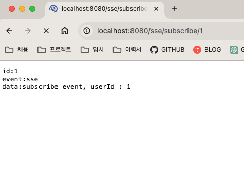 URL을 브라우저로 접속하면 아래 화면이 출력됩니다. 화면에 보이는 메시지는 SseEmitter 객체를 생성하는 시점에 503 에러를 방지하기 위해서 강제로 broadcast를 발생시킨 메시지입니다.