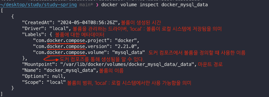 docker volume inspect docker_mysql_data를 통해 도커 볼륨에 대한 자세한 정보를 확인할 수 있습니다.
