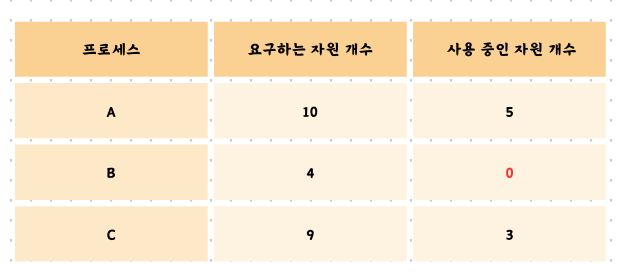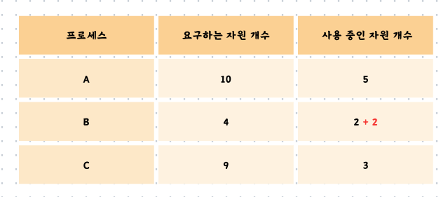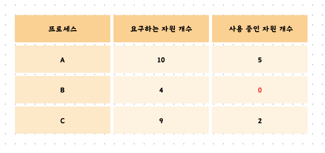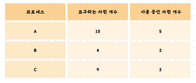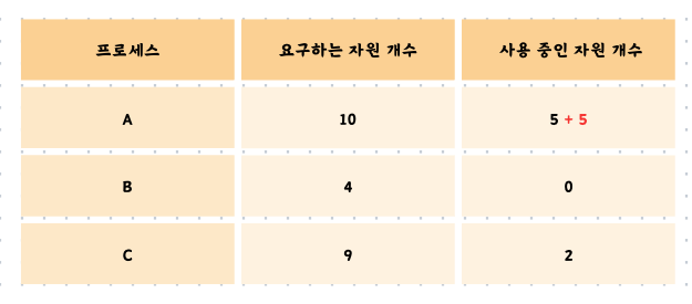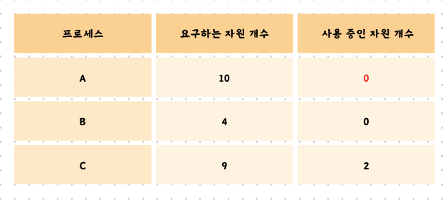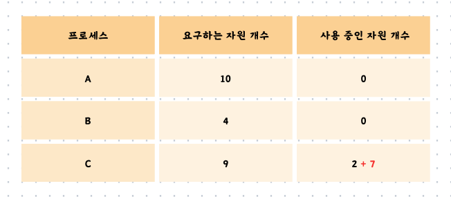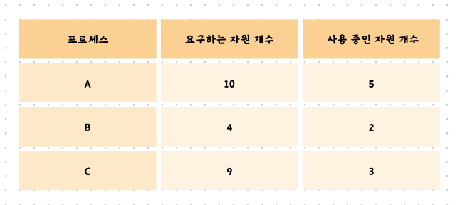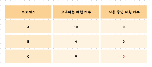 여기서 문제가 발생합니다. 프로세스 A와 C는 5개, 6개의 자원을 필요로 합니다. 그러나 현재 남은 자원의 개수는 4개이므로 어느 프로세스에도 할당할 수가 없습니다. 프로세스 A와 C는 서로가 보유하고 있는 자원을 할당받길 기다리게 됩니다. 이를 교착 상태가 발생했다고 합니다.