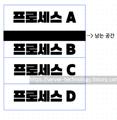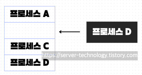 예를 들어, 프로세스 B가 보조기억장치로 스왑아웃되고 프로세스 D가 스왑인하는 과정을 생각해보자. 프로세스 B가 사용하던 공간이 비어있게 되고, 해당 공간을 프로세스 D를 적재하려고 했으나 메모리의 공간이 작아 적재할 수 없는 상황이 된다.