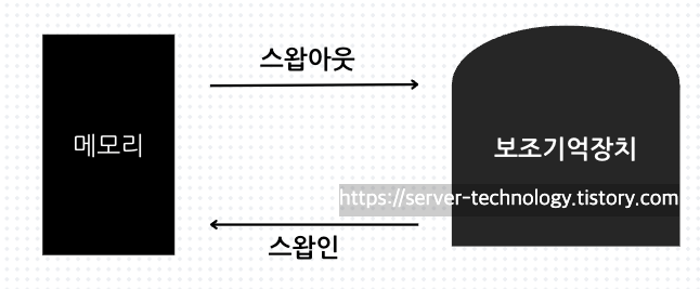 이때, 사용되지 않는 프로세스를 메모리에서 보조기억장치로 보내는 것을 스왑아웃(swap-out)이라 하고, 프로세스를 사용하기 위해 보조기억장치 -> 메모리로 적재하는 과정을 스왑인(swap-in)이라고 한다.