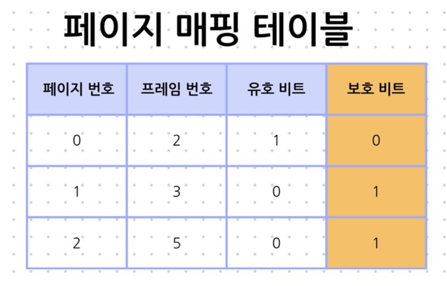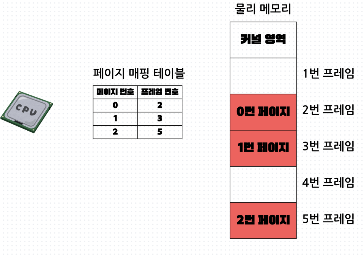 페이지 매핑 테이블을 통해 <페이지 번호, 변위>에서 <프레임 번호, 변위>로 변경된다.
