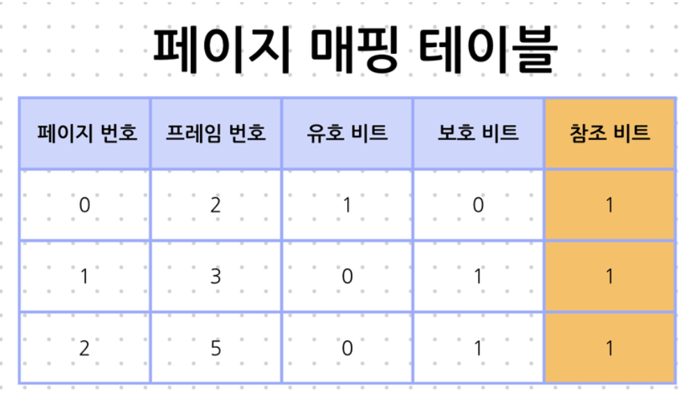 - 비트 1 : 메모리에 적재된 후에, CPU에 의해 접근된 적 있는 페이지