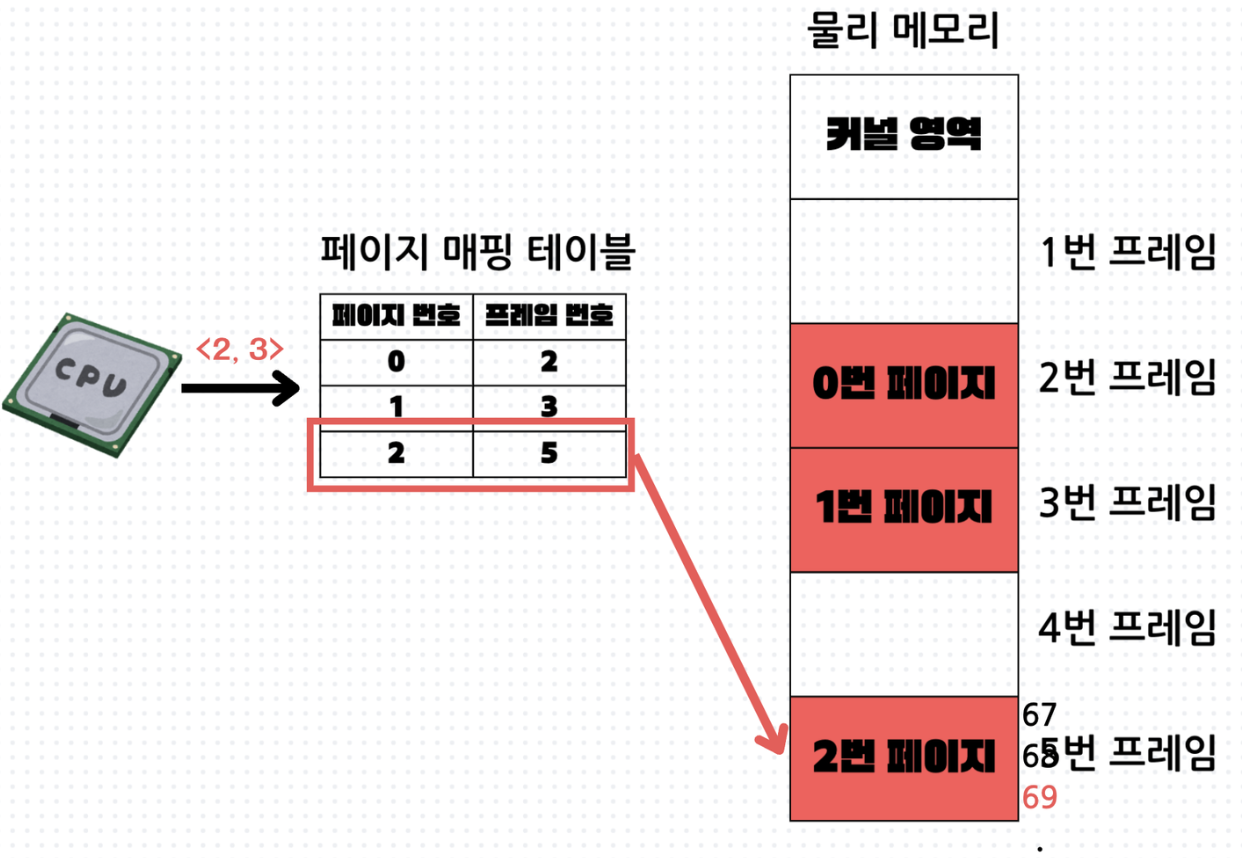CPU는 2번 페이지가 적재된 5번 프레임의 시작 번지 67에서 2만큼 떨어진 69번지에 접근한다.