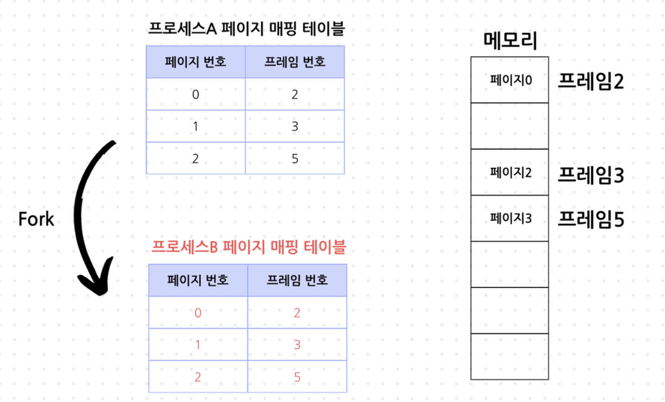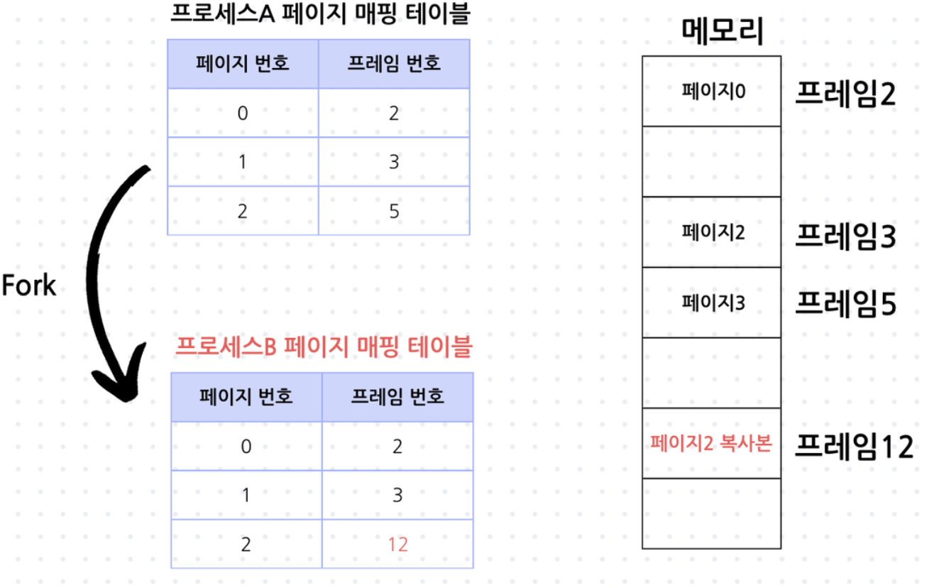 부모 프로세스 or 자식 프로세스에서 페이지에 쓰기 작업이 발생한다면 해당 페이지를 복사하여 메모리에 할당한다.