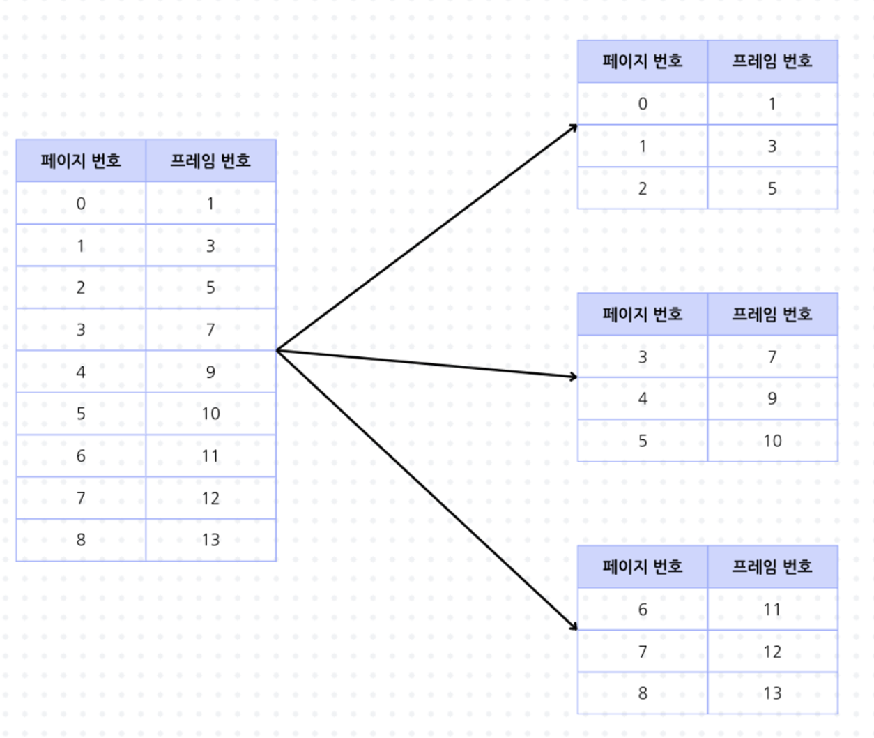 각 프로세스마다 페이지 매핑 테이블을 갖는다. 프로세스의 페이지 개수가 많아질수록 페이지 매핑 테이블의 크기 또한 커진다.