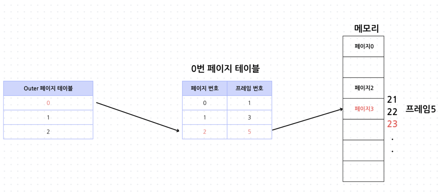 페이지 매핑 테이블을 여러 개로 나누어 사용할 경우 <바깥 페이지 번호, 안쪽 페이지 번호, 변위>로 접근한다.