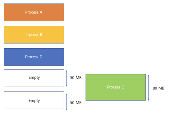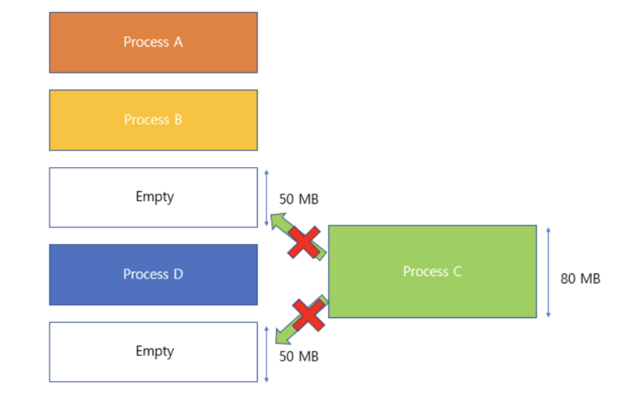 총 메모리 공간만 보았을 때 충분히 요청 메모리를 적재할 수 있으나, 남아있는 두 메모리가 연속적으로 위치하지 않아 적재할 수 없다.