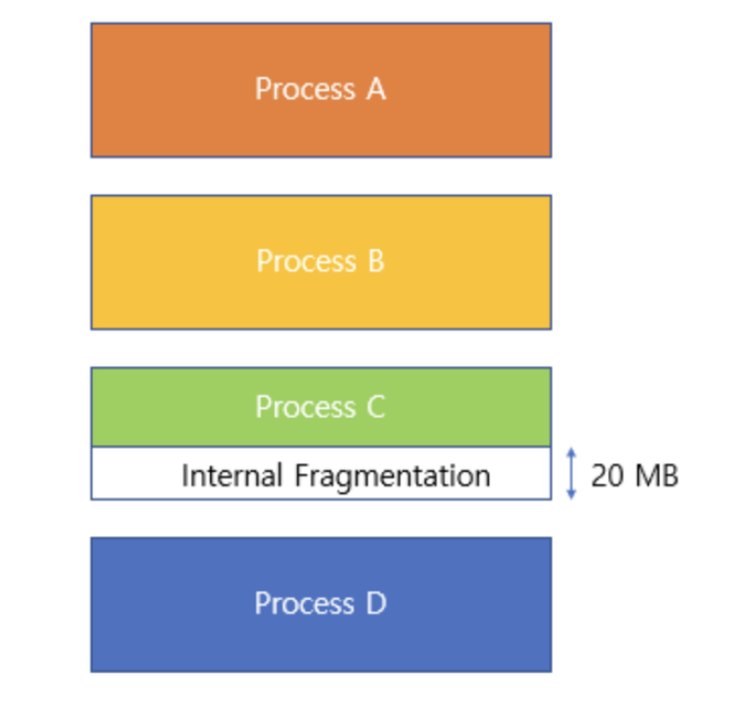 내부 단편화란 남아 있는 메모리 영역의 크기가 요청 메모리보다 커, 요청 메모리 적재 시에 사용되지 않는 메모리가 생기는 것을 의미한다.