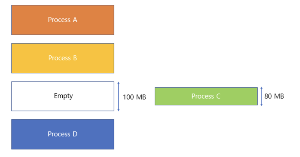 아래 사진을 보면 남아 있는 메모리 영역의 크기는 100MB이고 요청 메모리의 크기는 80MB이다. 남아있는 메모리의 크기가 요청 메모리보다 크므로 적재할 수 있다.